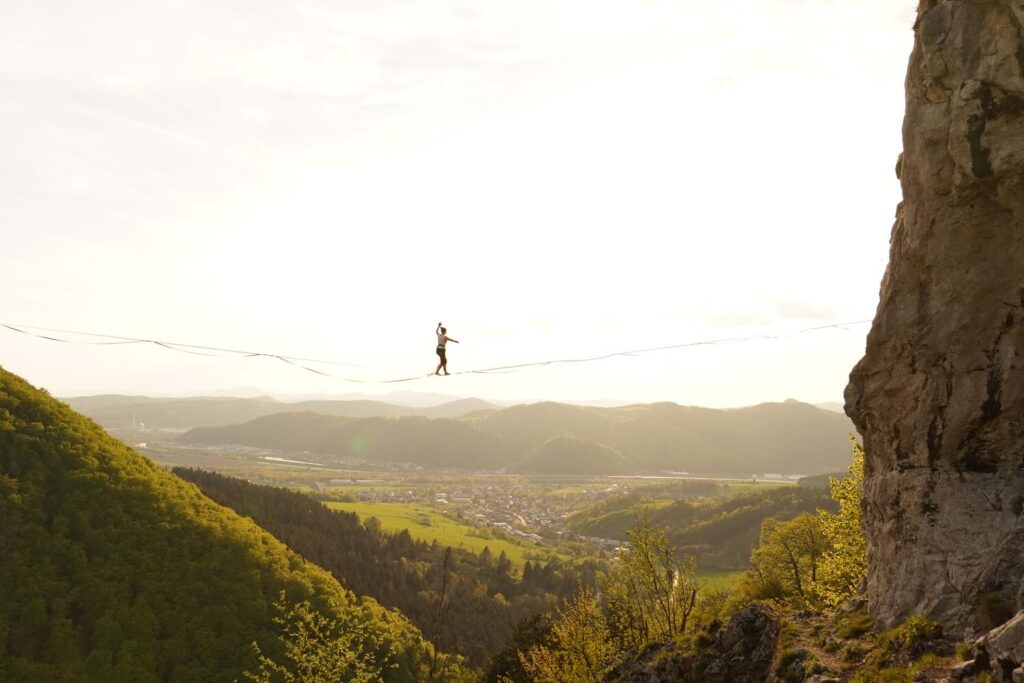 Niby jest to w każdym sporcie, ale na przykład biec można szybciej lub wolniej i nie wymaga to aż takiej ilości skupienia jak przejście się po slackline. To jest ten bardzo specyficzny rodzaj koncentracji na tej taśmie. Do tego też trzeba być sprawnym fizycznie, więc to co lubię to ta synergia wynikająca z połączenia pracy psychicznej i fizycznej. Jednocześnie na slackline angażujemy te mięśnie, które ciężko jest sobie wyćwiczyć w innych dyscyplinach…