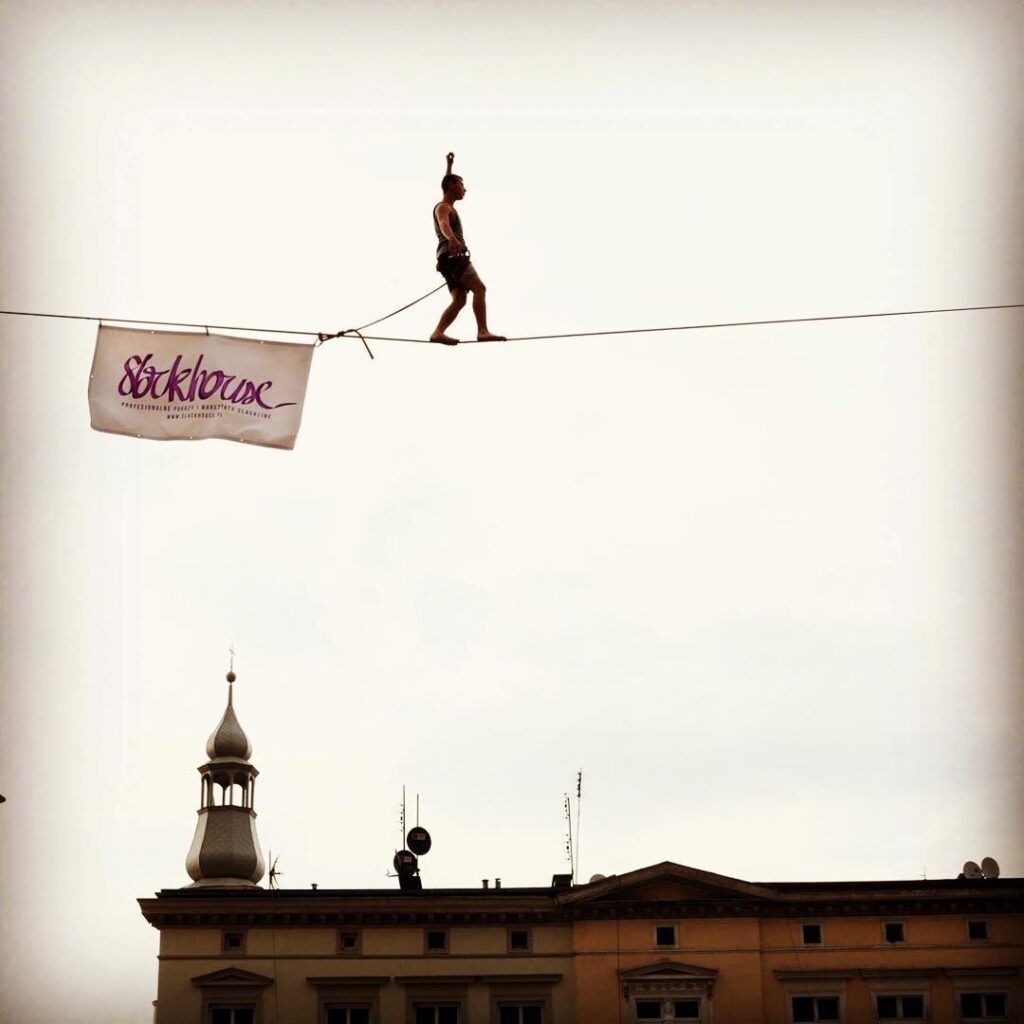 Pamiętam, że w speedlinach, tych za czasów jeszcze napiętych taśm takich, jakie były w Bydgoszczy (Mistrzostwa Świata w Przechodzeniu rzez Rzekę) na przykład, to też dużo osób używało butów. Nawet ja wtedy też biegałem w butach, pomimo tego, że highliny zawsze chodzę bez butów. W butach taśma bardziej wybaczała błędy. Czyli jeżeli postawiłeś stopę tylko kawałeczkiem na taśmie, to jeżeli wystarczająco szybko zrobiłeś kolejny krok, to wystarczało, żeby sylwetkę ustabilizować i pójść dalej. Natomiast przy gołej stopie, to jeżeli ją źle postawisz, to ona się łatwiej zsunie. Po prostu nie utrzymasz jej na taśmie i spadniesz. To trochę tak jak w przypadku buta wspinaczkowego. Jeżeli masz bardzo twardą podeszwę, to jesteś w stanie stać na czubku palców. A z kolei przy miękkiej podeszwie stopie nie wystarcza siły, żeby się utrzymać na samych palcach.