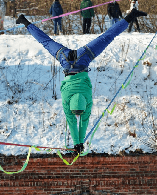 W naszej dyskusji pod postem na FB, dotyczącym slacklinowego obuwia zimowego, padło jeszcze kilka propozycji. Bardzo ciekawa wyszła od Adama Kamińskiego, wiceprezesa Stowarzyszenia Slackline Polska, freestylerela i instruktora highline. Adam mianowicie w okresie zimowym używa na wysokiej taśmie baletek akrobatycznych?! w które wkłada skarpetki antypoślizgowe? Skarpeta nie ślizga się w baletce, baletka nie ślizga się na taśmie i chroni przed wilgocią — ma to sens.